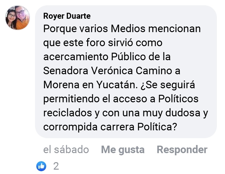 En la página de Facebook en la que el líder estatal morenista, Mario Mex Albornoz, presumió su participación en dicho foro, uno de sus seguidores le preguntó si había un acercamiento público con la senadora expriista y si se seguiría permitiendo el acceso a políticos reciclados y con una muy dudosa y corrompida carrera Política.