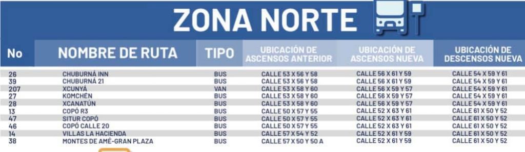En la zona norte, las rutas de Chuburná Inn y Chuburná 21 tendrán su sitio de ascenso en la calle 56 x 61 y 59 y de descenso en la calle 54 x 59 y 61; las zonas de ascensos de Xcunyá y de Komchén e Xcanatún será en la calle 56 x 59 y 57; y el descenso en la calle 54 x 59 y 61; mientras que los camiones de Copó R3, Situr Copó y Copó Calle 20 tendrán su punto de ascenso en la calle 52 x 63 y 61 y de descenso en la calle 61 x 50 y 52; y los usuarios de Villas la Hacienda y Montes de Amé–Gran Plaza ascenderán en la calle 52 x 61 y 59 y descenderán en la calle 61 x 50 y 52.