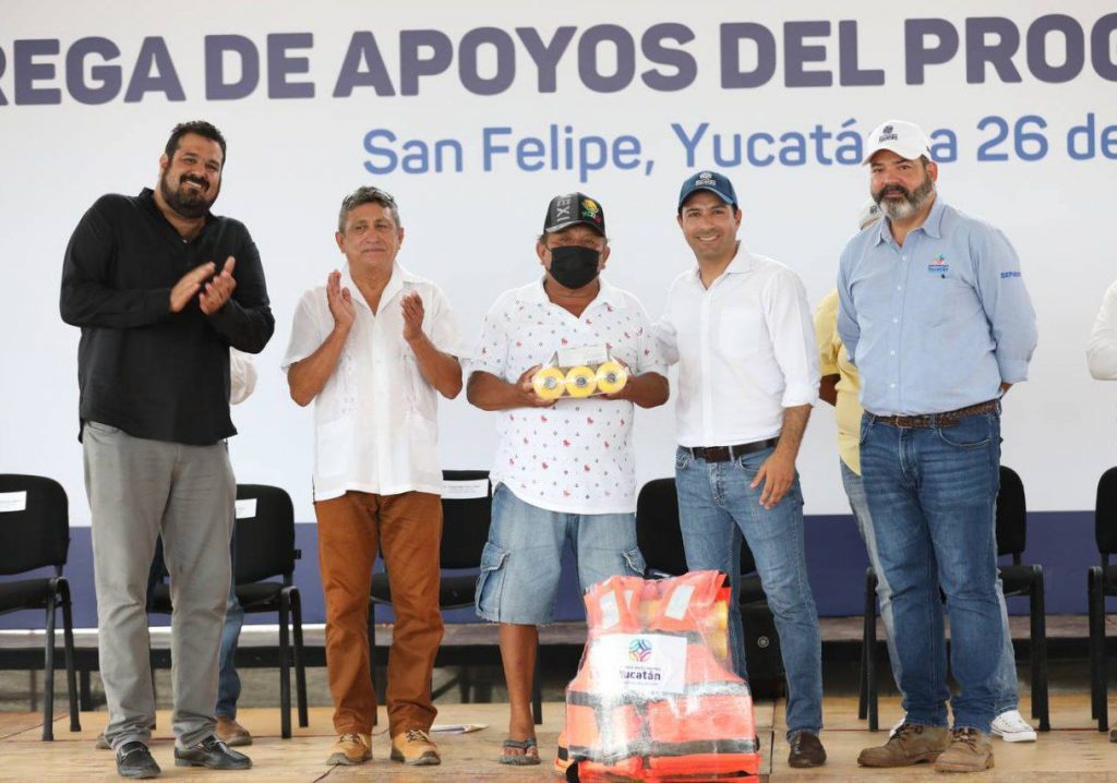 San Felipe, Yucatán, 26 de julio de 2022.- Durante la entrega de apoyos del programa Peso a Peso Pesquero y Acuícola a hombres y mujeres del oriente del estado, el Gobernador Mauricio Vial Dosal anunció un conjunto de acciones para impulsar esta actividad y el turismo, así como mejorar la imagen de San Felipe, proyectos que redundarán en mejores oportunidades y más empleos para las familias.