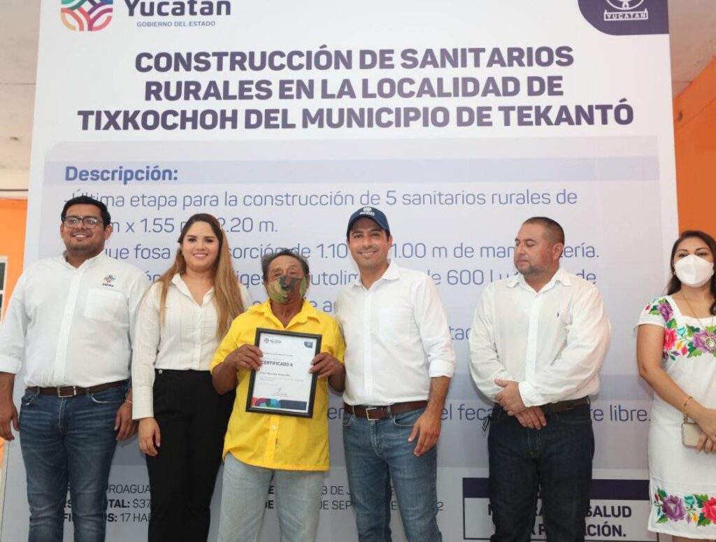 A su vez, el titular de la Secretaría de Desarrollo Social (Sedesol), Roger Torres Peniche, dijo que en esta zona se ejecutarán 20 acciones de vivienda, entre baños y cuartos, con cerca de 2 millones de pesos y para mejorar la salud de la población y reducir el fecalismo al aire libre, se construyeron 5 sanitarios rurales en Tixkochoh, con tanque séptico, biodigestor autolimpiable, tinaco, muebles, registros y alimentación hidráulica.