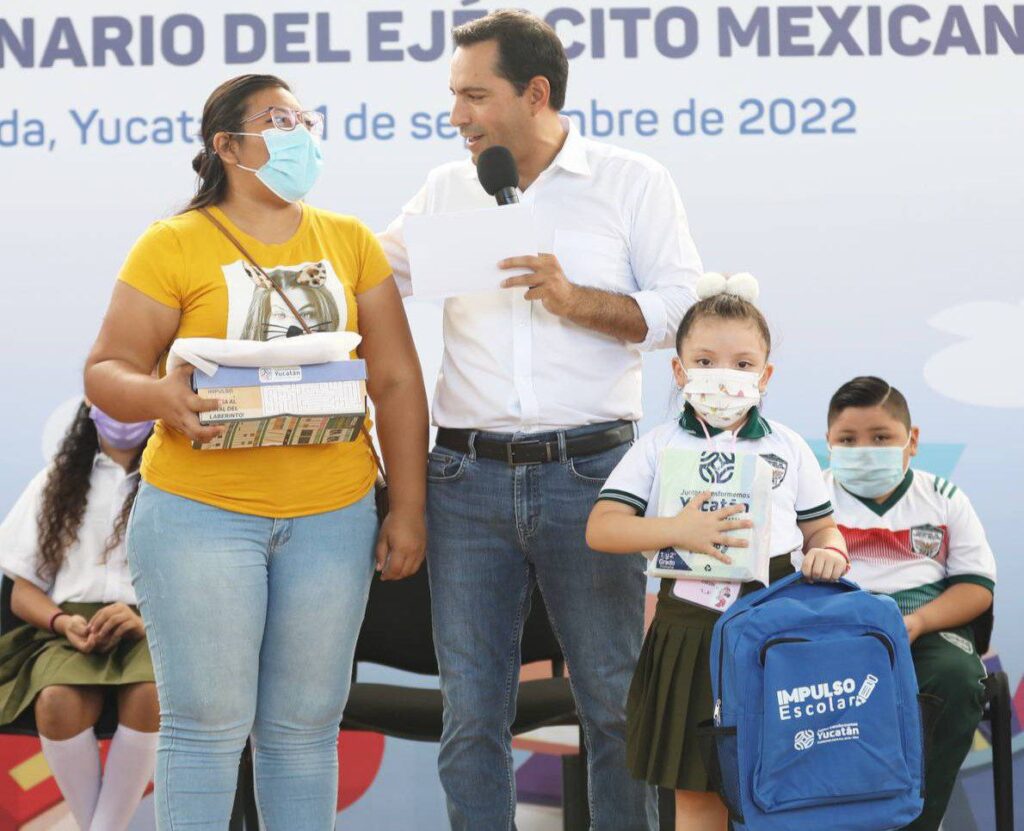 Mérida, Yucatán, 1 de septiembre de 2022.- El Gobernador Mauricio Vila Dosal comenzó a entregar a estudiantes yucatecos, sus uniformes y paquetes de útiles escolares del programa Impulso Escolar, apoyo que representa un ahorro de 2,850 pesos por cada estudiante para los padres y madres de familia.