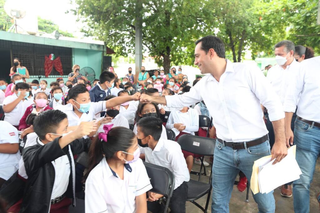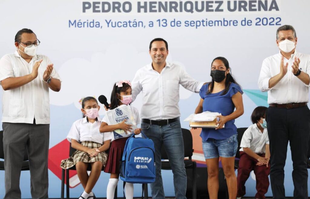 Mérida, Yucatán, 13 de septiembre de 2022.- La construcción de sanitarios, áreas de juego, pozos para evitar inundaciones, la entrega de mobiliario escolar y trabajos de mantenimiento general en escuelas del sur de Mérida, anunció el Gobernador Mauricio Vila Dosal al continuar con la entrega uniformes y útiles escolares del programa “Impulso Escolar” para garantizar que las niñas y los niños de Yucatán tengan las mismas oportunidades de aprendizaje y desarrollo de sus capacidades, al mismo tiempo que permite a los padres y madres de familia un ahorro de 2,850 pesos por cada estudiante.