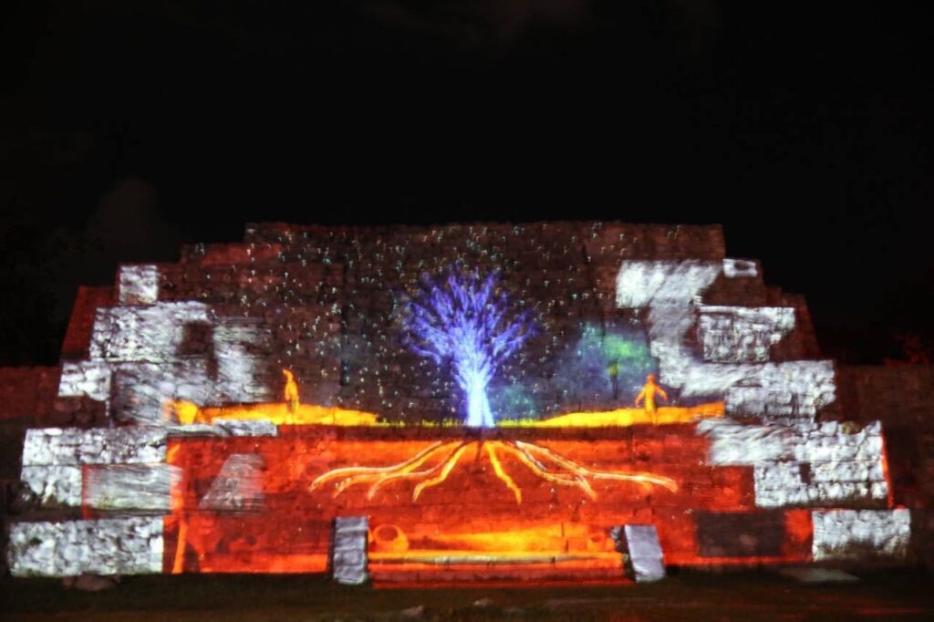 En este proyecto se emplean 9 proyectores con tecnología láser, además de más de 100 lámparas que iluminan los senderos y dan vida a los árboles. El guion fue escrito por arqueólogos yucatecos y supervisado y autorizado por el consejo de arqueología del INAH.
