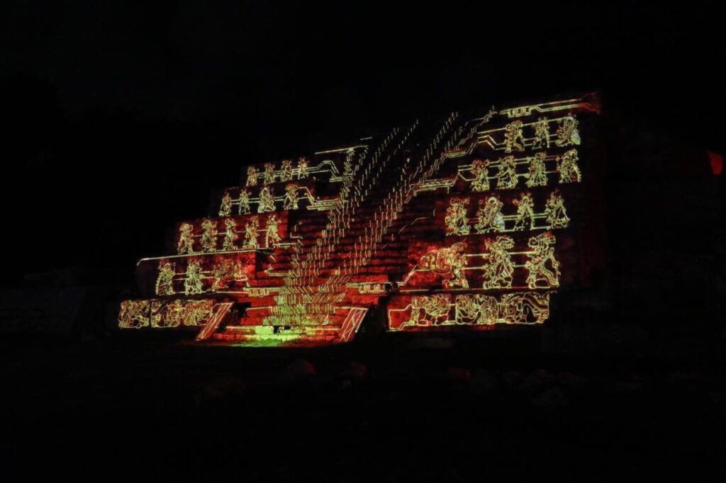 Acompañado del titular del Instituto Nacional de Antropología e Historia de Yucatán, José Arturo Chab Cárdenas, el Gobernador dio por inaugurado este nuevo proyecto, que consiste en un recorrido nocturno con 7 estaciones que, mediante el uso de audio e iluminación, da un innovador rostro al destino arqueológico ofreciendo a las familias yucatecas y el turismo una experiencia diferente para conocer más sobre los mayas y lo que este asentamiento representó.